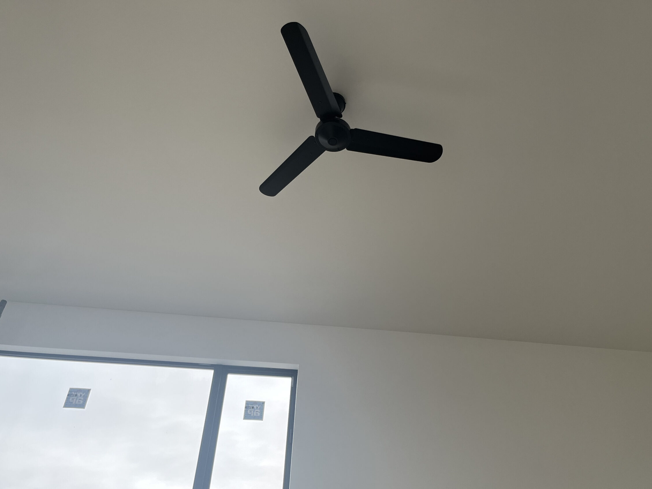 リビングの天井には、シーリングファンも取り付けられ、また一つ完成へと近づきました。