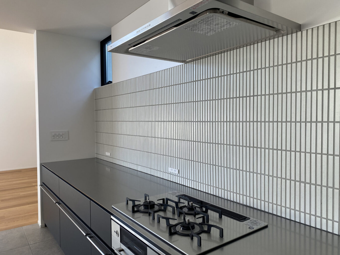 グレーの目地が輪郭を程よく強調し、キッチン全体の空間に馴染んでいます。