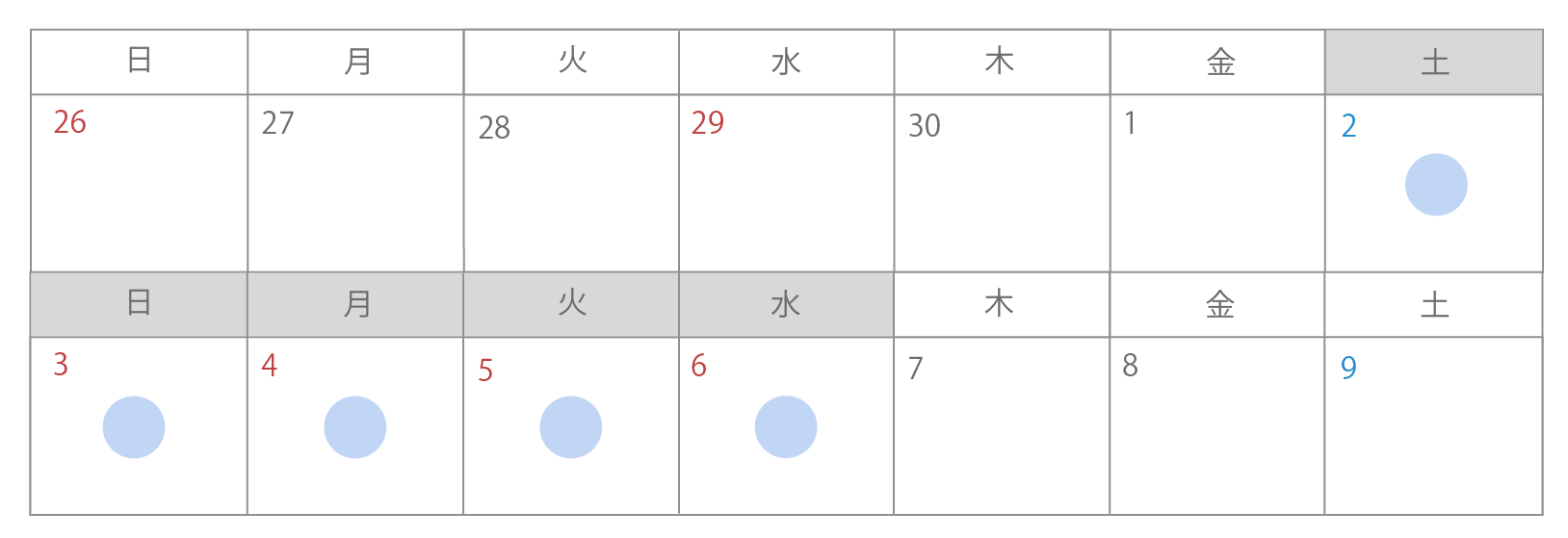 ゴールデンウィークに伴い、5月2日から5月6日までお休みさせていただきます。